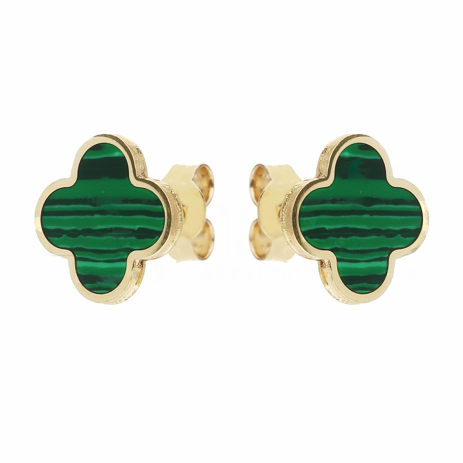 Gold type: Solid goldWeight in grams: 1.6GramsColor: Yellow goldStone: MalachiteDimensions: Four-leaf clover 10x10 mm